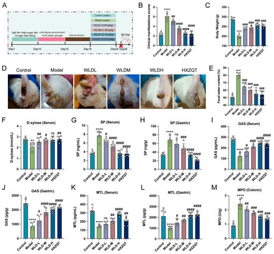 The protective effect of WLD on CDD rats. (A) A schematic diagram illustrates the experimental course in which WLD was used to treat CDD model rats. (B) Clinical symptom scores were evaluated in different groups (n = 6). (C) Body weight changes were recorded in different groups (n = 6). (D) The incidence of diarrhea was assessed in different groups (n = 6). (E) Fecal water content was measured in different groups (n = 6). (F) D-xylose levels in rat serum were analyzed across different groups. (G–L) Levels of various gastrointestinal hormones (SP, GAS, and MTL) in serum and gastric tissue were measured across different groups (n = 6). (M) MPO levels in colonic tissue were compared among different groups (n = 6). ** p < 0.001, *** p < 0.001, and **** p < 0.001 compared to the control group, and # p < 0.05, ## p < 0.01, ### p < 0.001, and #### p < 0.001 compared to the model group (ns: p > 0.05).