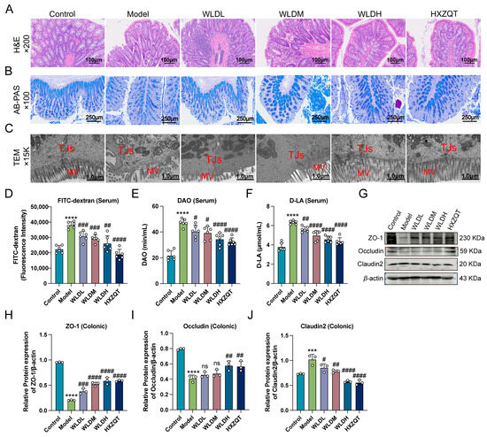 The alleviating effect of WLD on intestinal barrier damage. (A) Pathological changes in the colon of CDD rats were examined using the H&E staining method across different groups. Scale bar: 100 μm; original magnification: ×200. (B) Goblet cell populations in different groups were assessed using the AB-PAS staining method. Scale bar: 250 μm; original magnification: ×100. (C) The structures of microvilli and tight junctions were examined in different groups using transmission electron microscopy (TEM). Scale bar: 1.0 μm; original magnification: ×15 K. (D) FITC-dextran levels in rat serum were quantified across different groups (n = 6). (E,F) Various permeability indicators (D-AO and D-LA) were assessed in rat serum from different groups (n = 6). (G) Expression levels of different tight junction proteins were detected by Western blotting (WB). (H–J) The quantified analysis of different tight junction proteins was measured in different groups (n = 3). *** p < 0.001 and **** p < 0.001 compared to the control group, and # p < 0.05, ## p < 0.01, ### p < 0.001, and #### p < 0.001 compared to the model group (ns: p > 0.05).