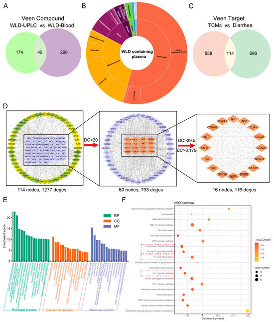 To investigate the components in WLD that may contribute to alleviating CDD, we administered WLD to the model rats and employed UPLC-MS/MS technology to analyze the plasma chemistry. This approach identified 348 components (Table S3), 49 of which were selected for further comparison with WLD’s mass spectrometry results and subsequent analysis (Figure 4A). These selected components were grouped into the following categories: alkaloids (9, 18.37%), terpenoids (8, 16.33%), organic acids (6, 12.24%), amino acids (5, 10.20%), fatty acids (5, 10.20%), phenols (4, 8.16%), flavonoids (1, 2.04%), vitamins (1, 2.04%), phenylpropanoids (1, 2.04%), polysaccharides (1, 2.04%), and others (8, 16.33%) (Figure 4B). A PPI network was constructed using 114 potential targets, which were identified as the intersection of 702 component-related targets and 804 disease-related targets (Figure 4C). This network, comprising 114 nodes and 1277 edges, was generated using the STRING database, and subsequently analyzed to identify core targets. Median values for degree centrality (DC), betweenness centrality (BC), and closeness centrality (CC) were 29.5, 0.179, and 0.5586, respectively. Thresholds were set at values greater than or equal to the median for these parameters. Using these criteria to prioritize key targets and interactions, the analysis was narrowed down to 16 nodes and 116 edges (Figure 4D). Among the most pivotal targets identified were genes such as IL-2, TLR4, EGFR, IL-6, and AKT1. These genes are known to play critical roles in the development and progression of diarrhea-related diseases. To explore the functional roles of these targets, GO and KEGG enrichment analyses were performed using the DAVID database. GO enrichment analysis revealed that WLD primarily influenced biological processes (BP), cellular components (CC), and molecular function (MF), such as positive regulation of gene expression, protease B signaling, protein phosphorylation, inflammatory response, cell proliferation feedback, neuroprotection, receptor complex formation, enzyme activity, cytokine activity, and protein binding (Figure 4E). Furthermore, Kyoto Encyclopedia of Genes and Genomes (KEGG) pathway enrichment analysis showed that WLD modulated several key signaling pathways, including T-cell receptor signaling, Th1/Th2 cell differentiation, Th17 cell differentiation, IL-17, PI3K-AKT, MAPK, and HIF-1 signaling (Figure 4F). Together, these findings suggest that WLD exerted a protective effect by regulating key pathways, particularly those involved in T-cell receptor signaling, Th1/Th2 cell differentiation, and Th17 cell differentiation.