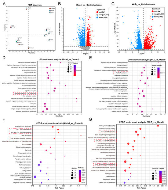 To further investigate the mechanism of CDD alleviation by WLD, we performed transcriptomic sequencing of colonic tissues. Principal component analysis (PCA) revealed a significant separation between the model group and the other two groups, while some overlap was noted between the control group and the WLD administration group. This partial overlap indicates that WLD had a notable alleviating effect on CDD (Figure 5A). Comparative analysis indicated that in the model group, 1547 genes were upregulated and 1506 genes were downregulated compared to the control group (Figure 5B). In contrast, the WLD group showed 2164 upregulated genes and 2369 downregulated genes relative to the model group (Figure 5C). GO enrichment analysis revealed that WLD influenced several biological processes, including T-cell differentiation, DNA replication proliferation, antigen-receptor-mediated signaling pathway, adaptive immune response, and B-cell activation regulation (Figure 5D,E). Furthermore, KEGG pathway enrichment analysis revealed significant alterations in pathways related to Th17 cell differentiation, Th1 and Th2 cell differentiation, and T-cell receptor signaling when comparing the WLD group to the model and control groups (Figure 5F,G). Additionally, differentially expressed genes showed that WLD affected Th1/Th2 cell pathway-related genes (Nfatc2, Lck, Lat, Cd247, Cd3d, IL2ra, and IL2rb; Figure S4A,B), the Th17 cell pathway-related genes (Nfatc2, Irf4, IL27ra, Lck, Lat, Cd247, Cd3d, IL2ra, and IL2rb; Figure S4C,D), and the T-cell receptor pathway-related genes (Lat, Lck, Cd247, Cd3d, and Nfatc2; Figure S4E,F). For example, Lat and Lck play crucial roles in T-cell maturation and signaling. Cd247 and Cd3d are expressed on the surface of T lymphocytes, where they play a major role in adaptive immunity. Additionally, the Nfatc2 gene is involved in cytokine expression by T-cells. In conclusion, these genes are crucial for T-cell differentiation, maturation, and signal transduction. The pathway analysis revealed significant enrichment in signaling pathways related to T-cell differentiation (Th1/Th2 and Th17/Treg cell) following WLD administration. These findings suggest that WLD, to a certain extent, modulated intestinal immunity by influencing immune function, thereby alleviating CDD.