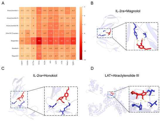 Molecular docking of representational components in WLD with key targets in the Th1/Th2 and Th17/Treg pathways. (A) Post-docking binding energy thermograms for seven components of WLD with ten key proteins in the Th1/Th2 and Th17/Treg signaling pathways. (B) Molecular docking of IL-2ra with Magnolol. (C) Molecular docking of IL-2ra with Honokiol. (D) Molecular docking of LAT with Atractylenolide-III.