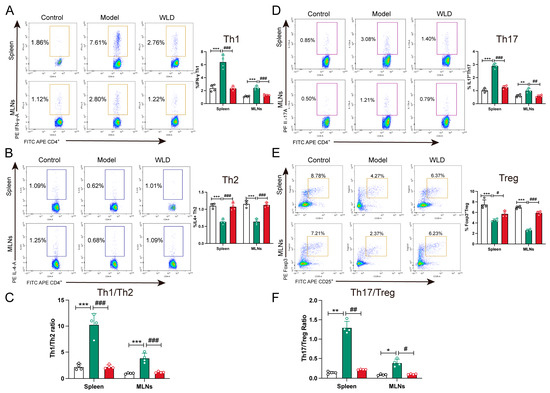 WLD treatment regulates the ratio of Th1/Th2 and Th17/Treg in the spleen and mesenteric lymph nodes (MLNs). (A,B) The cell populations of Th1 and Th2 in different groups were detected by flow cytometry (n = 4). (C) The Th1/Th2 cell ratio was analyzed using GraphPad software (n = 4). (D,E) The cell populations of Th17 and Treg in different groups were also detected by flow cytometry (n = 4). (F) The Th17/Treg cell ratio was analyzed using GraphPad software (n = 4). * p < 0.05, ** p < 0.01, and *** p < 0.001 compared to the control group, and # p < 0.05, ## p < 0.01, and ### p < 0.001 compared to the model group. White column was control group, green column was model group, and red column was WLD group.