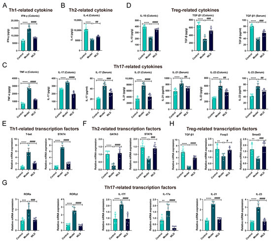 WLD regulated the levels of inflammatory factors and transcription factors associated with Th1/Th2 and Th17/Treg cell differentiation. (A,B) The levels of Th1- (IFN-γ) and Th2-related inflammatory factors (IL-4) in serum were measured across different groups (n = 6). (C) Th17-related inflammatory factors (TNF-α, IL-17, IL-21, and IL-23) were quantified in both serum and colonic tissue in different groups (n = 6). (D) Treg-related inflammatory factors (IL-10 and TGF-β) were assessed in serum and colonic tissue in different groups (n = 6). (E,F) Levels of Th1/Th2-related transcription factors (T-bet, STAT4, GATA3, and STAT6) were measured in colonic tissue across different groups (n = 6). (G) Th17-related transcription factors (RORa, RORγt, IL-17f, IL-17a, IL-21, and IL-23) were quantified in colonic tissue in different groups (n = 6). (H) Treg-related transcription factors (TGF-β1, Foxp3, and Smad3) were quantified in colonic tissue in different groups (n = 6). ** p < 0.01, *** p < 0.001, and **** p < 0.0001 compared to the control group, and # p < 0.05, ## p < 0.01, ### p < 0.001, and #### p < 0.0001 compared to the model group.