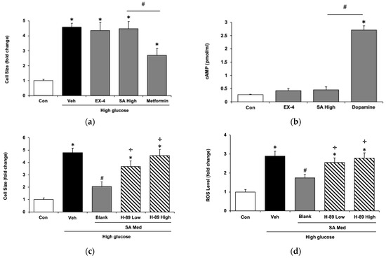 2.1. Syringaldehyde (SA) Activated GLP-1 Receptors in Cardiomyocytes and Alleviated Cardiac Hypertrophy Induced by Hyperglycemia in H9c2 Cells