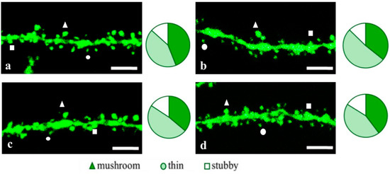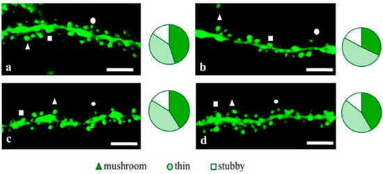 Confocal images of the CA1 secondary dendrites in 5 month-old female M (a) end 5xFAD-M mice injected with a physiological solution (b), EDR peptide (c), KED peptide (d). Confocal microscopy, ×100. Scale bar, 10 μm.