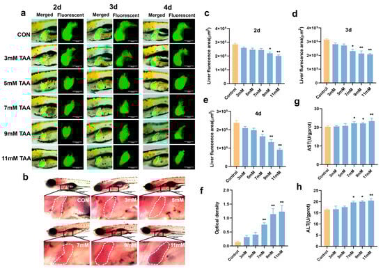 The Tg (−1.7apoa2:GFP) zebrafish is a transgenic line expressing green-fluorescent protein reporter genes driven by the 14 kDa apolipoprotein (Apo-14) promoter sequence. The continuous expression of green-fluorescent protein driven by the Apo-14 promoter in the hepatocytes, hepatic progenitor cells, and liver cells of both liver primordia and zebrafish allows for the detailed observation and documentation of liver organogenesis [24]. A transgenic Tg (−1.7apoa2:GFP) zebrafish with a green-fluorescently labeled liver was used to establish a TAA-induced ALI model. Following TAA treatment, zebrafish larvae exhibited liver damage to a certain extent (Figure 1a). The fluorescent area of the liver in the TAA-treated group decreased compared with the control group. This reduction in fluorescence was dose-dependent and became more pronounced with higher TAA concentrations and longer exposure times (Figure 1a,c–e), indicating that TAA caused liver damage in the larvae. By 6 days post fertilization (dpf), the yolk sac was insufficient to provide nutrients for the larvae, necessitating exogenous food for proper nutrition. In order to stop food from interfering with the experiment, we selected 7 mM TAA to treat larvae at 72 h post-fertilization (hpf) for 3 days. To further verify the validity of this modeling condition, a liver enzyme activity assay and Oil Red O staining assay were utilized for relevant verification.