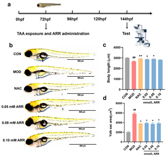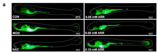 The phenomenon of yolk sac uptake is used as a test when evaluating the hepato-protective effects of drugs on zebrafish. In this study, the protective effect of ARR was assessed by measuring body length changes in zebrafish in relation to the phenomenon of yolk sac resorption. Zebrafish larvae were exposed to a 7 mM TAA solution at 72 hpf and simultaneously administered ARR at concentrations of 0.05, 0.08, and 0.10 mM. Above 0.20 mM, ARR caused deformities and some mortality in the zebrafish (Figure S1). After 3 days of TAA treatment, the larvae exhibited an obviously smaller body length compared with the control group, and the yolk sac absorption area was significantly larger. N-acetylcysteine (NAC) is a well-known antioxidant and can be used clinically as a therapeutic agent for liver injury [25]. In this experiment, NAC was used as a positive control. Compared with the TAA group, the growth and development of zebrafish in the positive control NAC group were significantly improved (p < 0.05). With the addition of ARR, the growth and development of the larvae improved significantly (p < 0.05). The body length of the larvae reached the same level as that of the control group, and the delay in yolk sac absorption was considerably reduced (Figure 2a–c). These findings suggest that ARR can attenuate TAA-induced developmental toxicity in larvae.