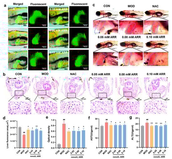 Effects of ARR on TAA-induced liver injury. (a) Effect of ARR on the fluorescence area of the liver of Tg (−1.7apoa2:GFP) zebrafish larvae exposed to TAA. (b) HE staining of wild-type AB zebrafish larvae. (c) Oil Red O staining of wild-type AB zebrafish larvae (n = 10). (d) Liver fluorescence area statistics for each group. (e) Statistics of lipids in the liver. (f) The activity of AST. (g) The activity of ALT. Scale bar = 100 μm. * p < 0.05, ** p < 0.01 vs. control; ## p < 0.01 vs. model (mean ± SEM).