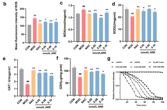 HepG2 cells were stimulated with TAA, and intracellular ROS fluorescent levels were measured for each group to evaluate whether ARR exhibited a better antioxidant capacity at the cellular level. Compared with the control group, HepG2 cells in the TAA group exhibited an enhanced intensity of green fluorescence, indicating that TAA induced oxidative damage in the HepG2 cells (Figure 6d,g). In contrast, treatment with 0.02, 0.04, and 0.06 mM of ARR resulted in a dose-dependent decrease in ROS fluorescence intensity (p < 0.05), suggesting that ARR inhibits TAA-induced oxidative damage in HepG2 cells.