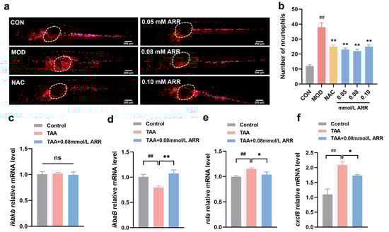 Effects of ARR on TAA-induced inflammation. (a) Effect of ARR on neutrophil migration in Tg (lyz:DsRED2) transgenic zebrafish larvae (n = 15). White color indicates the position of the yolk sac and swim bladder. (b) Statistics of the number of migrating neutrophils. (c) Expression level of ikbkb. (d) Expression level of ikbaB. (e) Expression level of rela. (f) Expression level of cxcl8. Scale bar = 200 μm. n = 3. * p < 0.05, ** p < 0.01 vs. control; ## p < 0.01 vs. model; ns: p > 0.05 (mean ± SEM).