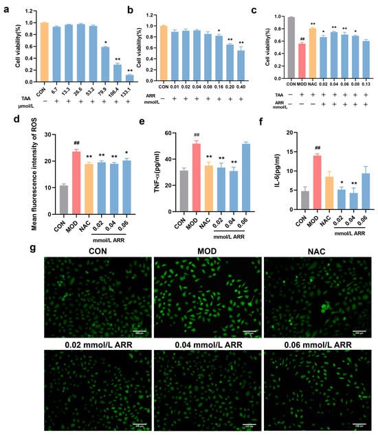 Effects of ARR on TAA-induced levels of ROS and inflammatory factors following TAA induction. (a) Effect of TAA on the viability of HepG2 cells. (b) Effect of ARR on the viability of HepG2 cells. (c) Effect of ARR on TAA-induced survival of HepG2 cells. (d) ROS levels. (e) Content of TNF-α. (f) Content of IL-6. (g) Effect of ARR on TAA-induced ROS levels in HepG2 cells. Scale bar = 200 μm. n = 3. * p < 0.05, ** p < 0.01 vs. control; ## p < 0.01 vs. model (mean ± SEM).
