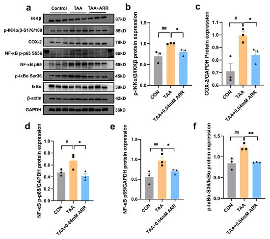 NF-κB plays a critical role in inflammation. Therefore, we examined the expression of proteins related to the IKKβ/NF-κB signaling pathway in HepG2 cells to determine how ARR suppressed NF-κB activation using Western blotting. Notably, the expression levels of NF-κB p65, NF-κB p-p65, COX-2, p-IκBα, and p-IKKα/β proteins were significantly upregulated in the TAA group compared with the control group (p < 0.05). However, 0.04 mM ARR significantly suppressed the phosphorylation of NF-κB p65, IκBα, and IKKα/β in TAA-treated HepG2 cells (Figure 7a–e) and concurrently decreased the expression level of COX-2 (p < 0.05) (Figure 7a,c). The anti-inflammatory effect of ARR may be attributed to the inhibition of IKKβ/NF-κB signaling pathway activation.
