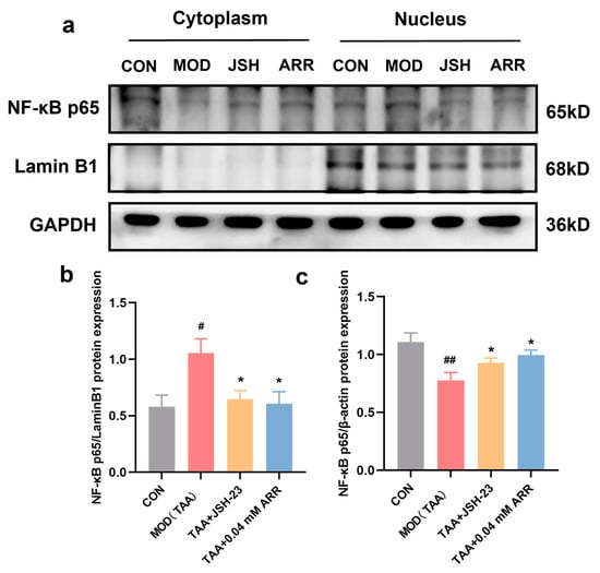 To assess whether ARR could inhibit the nuclear translocation of NF-κB p65 and thereby reduce the inflammatory response, we extracted cytoplasmic and nuclear proteins to measure NF-κB p65 expression. Notably, following the TAA stimulation of HepG2 cells, the nuclear content of the NF-κB p65 protein was significantly elevated compared with the control group (p < 0.05). JSH-23 is an NF-κB-specific chemical inhibitor that blocks the translocation of NF-κB p65 to the nucleus and was used in this experiment as a positive control. After the use of JSH-23, the expression of NF-κB p65 in the nucleus after TAA treatment was significantly reduced, and its expression in the cytoplasm was increased (p < 0.05). Further, compared to the TAA group, the nuclear content of the NF-κB p65 protein significantly decreased after treatment with 0.04 mM ARR (Figure 8a,b). Conversely, the cytoplasmic NF-κB p65 protein levels were significantly reduced after TAA stimulation (p < 0.05) (Figure 8a,c), whereas the 0.04 mM ARR treatment significantly increased cytoplasmic NF-κB p65 protein expression (p < 0.05). Under normal conditions, the NF-κB p65 protein predominantly resides in the cytoplasm. TAA stimulation prompted a gradual relocation of NF-κB p65 from the cytoplasm to the nucleus. However, intervention with ARR prevented the nuclear translocation of NF-κB p65, suggesting a potential mechanism for mitigating cellular inflammation.