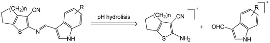 The Gewald adduct 14 (1 eq., 1.1 mmol) and the respective substituted indolic aldehydes (1 eq.) were added to a round-bottom flask and solubilized in ethanol (5 mL). The acetic acid catalyst was dripped into the reaction medium (10 drops), and the reactions were kept stirring at room temperature and monitored by TLC. Once completed, the obtained precipitates were purified by filtration and washing with cold ethanol.