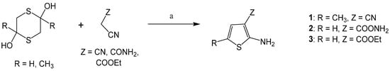 Thus, to synthesize compounds 1–3 (4-unsubstitued 2-AT), the fourth version of the Gewald reaction was used. 1,4-Dithiane-2,5-diol derivatives were condensed with α-activated acetonitrile (malononitrile, ethyl cyanoacetate, or cyanoacetamide) in a basic ethanolic medium (Scheme 1).