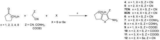 All other Gewald adducts were obtained by reacting different α-activated acetonitrile (malononitrile, ethyl- and tert-butyl-cyanoacetate, or cyanoacetamide) with cycloalkylketones (cyclopentanone, cyclohexanone, cycloheptanone, cyclooctanone, and cycloundecanone) for compounds 4–12, 7CN, and 8CN; 4-alkyl-cyclohexanones for compounds 13–16 and 20; 4-Boc-piperidone for compounds 17, 19, 21, and 22; 4-N-benzyl-piperidone for compound 18; and sulfur or selenium in a basic ethanolic medium. Compound 23 was obtained by the Boc deprotection of compound 17 using a mixture of dichloromethane and trifluoroacetic acid (8:2) (Scheme 2 and Scheme 3).