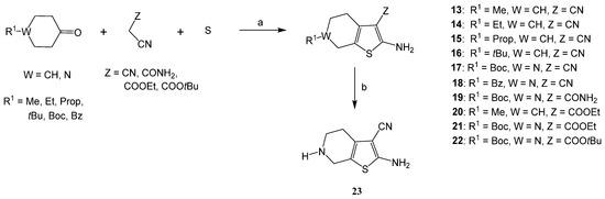 Synthesis of 2-AT following the Gewald methodology starting from 4-alkyl-cyclohexanones, 4-N-benzyl-piperidone, and 4-Boc-piperidone: (a) morpholine, ethanol, reflux, 3–22 h; (b) CH2Cl2/TFA (8:2), 0–5 °C, 20 min.