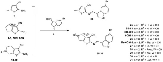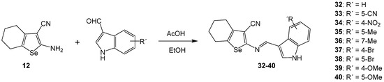 The condensation reactions of 5-bromoindole-3-carboxaldehyde with 2-aminothiophenes yielded the 2-aminothiophene-indole hybrids 24-31, SB-83, SB-200, 8CN83, and Me-6CN83 (Scheme 4), and the condensation of substituted-indole-3-carboxaldehyde with 2-aminoselenophene 12 yielded the 2-aminoselenophene-indole hybrids 32–40 (Scheme 5), according to a previously described procedure [22,26].