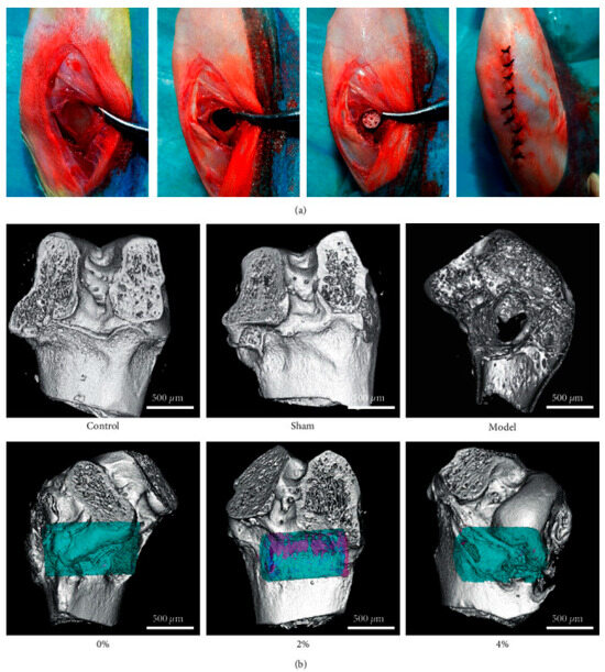 A 3D-printed PLGA scaffold composite peptide hydrogel implant with BMP-9 and P-15 in the treatment of bone defects in rabbits. (a) Implantation in rabbit bone process. (b) MicroCT test used for the detection of new bone formation and tissue-related protein expressions (blue, scaffold; pink, new bone). The MicroCT detection of 2% polypeptide scaffold showed good bone repair, promoting the expression of ALP, COL-1, OCN, RUNX2, and Sp7. Adopted with permission [38].