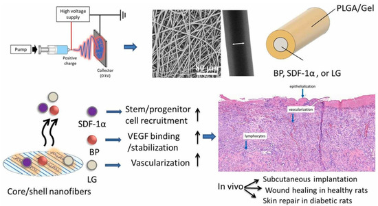 Shows stromal cell-derived factor-1α (SDF-1), vascular endothelial growth factor (VEGF)-binding peptide (BP), glucagon-like peptide-1 analog (GLP), and liraglutide (LG) in core/shell poly(L-lactide-co-glycolide)/gelatin fibers used to harness synergistic effects for skin repair in healthy and diabetic wound models in rats. Adopted with permission [37].