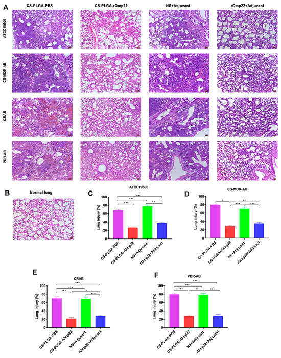 Histopathology of lung tissue specimens stained with haematoxylin-eosin and observed under a microscope (200×) taken from six mice with A. baumannii from each group at 24 h post-challenge. (A) Lung tissue from different immunized groups subjected to A. baumannii ATCC 19606 and three clinical A. baumannii strains (scale bar, 50 μm). (B) Lung tissue from unimmunized uninfected normal BALB/c mice with normal histological characteristics (scale bar, 50 μm). (C–F) Semiquantitative analysis of the inflammatory area in the lung tissue (n = 6). The histograms with mean percentage of lesion area within the total lung. Data are presented as the means ± SD (n = 6). * p < 0.05, ** p < 0.01, *** p < 0.001. Adopted with permission [30].