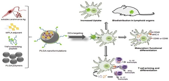 PLGA NPs surface-modified with a TNF-α-mimicking peptide encapsulated with soluble Leishmania antigens (sLiAg) and MPLA adjuvant. The synthesized PLGA NPs exhibited low cytotoxicity levels, efficient uptake by dendritic cells (DCs), induced maturation and functional differentiation, and increased stimulation of IL-12 and IL-10 production. Adopted with permission [121].