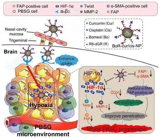 - Zhao, X.; Ni, S.; Song, Y.; Hu, K. Intranasal delivery of Borneol/R8dGR peptide modified PLGA nanoparticles co-loaded with curcumin and cisplatin alleviate hypoxia in pediatric brainstem glioma which improves the synergistic therapy. J. Control. Release 2023, 362, 121–137. [Google Scholar] [CrossRef]
