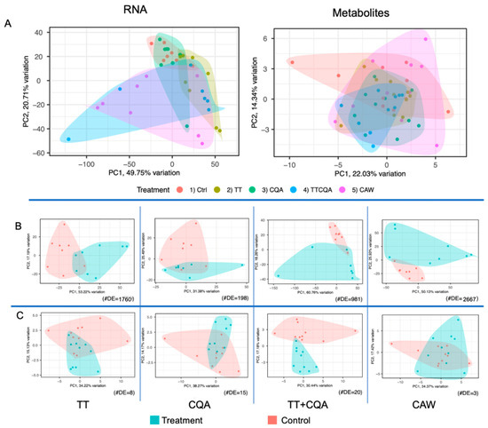 PCA plots for the two untargeted molecular domains of metabolomics and transcriptomics. (A) All treatments plotted together, including the vehicle control, for either metabolic or RNA-seq data. (B) RNA-seq data, each treatment compared individually to control. (C) Metabolic data, each treatment compared individually to control. For (B,C), the number of differentially expressed metabolites or genes (#DE) is shown in the lower right corner of each plot. The plots are also ordered left to right by increasing number of CA compounds in each treatment.