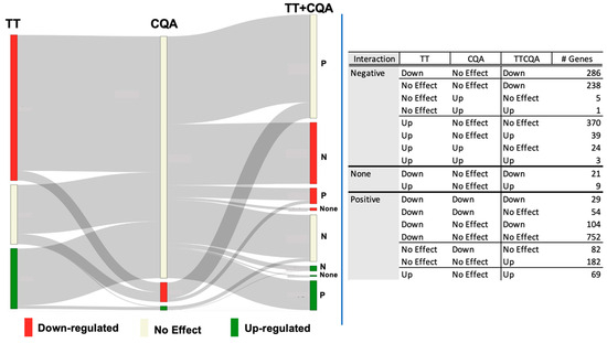 Effect on gene expression of the TT and CQA compounds administered separately and interactions between these groups observed in the TTCQA-treated samples. The figure on the left shows a mapping of the interactions listed in the table on the right. Any gene with significant expression changes, relative to control, seen with any of the TT, CQA, or TTCQA treatments are represented in the figure and table (N = 2268 unique genes). The relative number of genes and the expression status are represented within each of the three columns labeled TT, CQA, or TTCQA (red = significant downregulation, green = significant upregulation, beige = no significant expression changes seen with this treatment). The TT and CQA compound ‘Interaction effect’ for the combined group is shown next to the TTCQA column (‘P’ = positive, or synergistic; ‘N’ = negative, or antagonistic; ‘none’ = additive, or no interaction). The gray ribbons show the number of genes interacting between TT and CQA, the interaction status, and the final expression status in the TTCQA treatment. The table on the right shows the number of genes in each category. As an example, a positive interaction has a higher fold change value in the TTCQA treatment than the sum of the two-fold change values from TT and CQA, and a negative interaction has a lower TTCQA fold change than the sum of TT and CQA fold changes. So a positive interaction could still result in a downregulated or unregulated TTCQA gene, and a negative interaction could result in an upregulated or unregulated TTCQA gene.