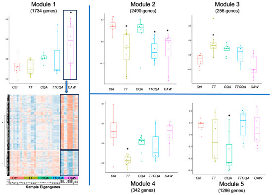 Sample eigengene distributions for the five gene co-expression modules with significant eigengene differences between at least one treatment and control. Boxplots for module eigengene distributions by each treatment group (* p-value ≤ 0.05). Module 1 = Extracellular Matrix Organization and Collagen Biosynthesis, Module 2 = Fatty Acid Metabolism, Module 3 = Cellular Response to Stress and Stimuli, Module 4 = Immune System, Module 5 = Electron Transport and Mitochondrial Biogenesis. Module 1 also shows a heat map of individual gene expression levels (blue = low, red = high). The highlighted section represents samples in the significant treatment for this module. See Supplementary Figure S6 for heatmaps for Modules 2–5.