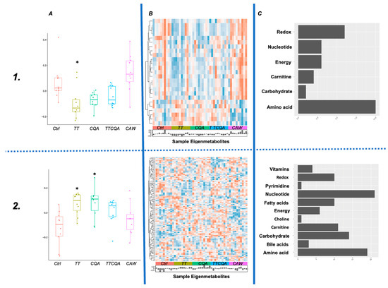 Metabolite co-abundance modules with significant eigenmetabolite differences between at least one treatment and control (1. Module 1 n = 25 metabolites, 2. Module 2 n = 100 metabolites). (A) Boxplots for module eigenmetabolite distributions by each treatment group (* adj p-value ≤ 0.05). (B) Heatmap of individually scaled metabolite abundance for the module (red = high abundance, blue = low abundance). Samples are ordered by treatment group and labeled on the horizontal axis. Histogram shows eigenmetabolite values for each sample. (C) Metabolite category counts for all metabolites in the module.