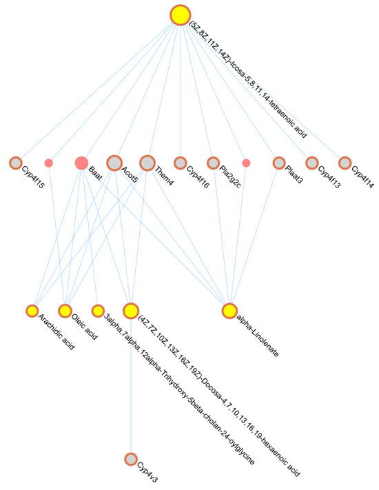 The 1760 DEGs and 133 DAMs (8 individual DAMs, 25 from Module 1, and 100 from Module 2) identified following TT treatment were used as seeds to construct the composite network as described in Section 4.8. This network was constructed without the necessity of additional connector genes/proteins to contain the maximum number of seeds possible. However, there were genes in the metabolite-gene network that were not differentially expressed by TT. There were 6 communities detected in the composite network that contained both a gene and metabolite seed, for a total of 37 metabolites and 42 genes in close functional relationship to each other (see Supplementary Table S9). Reactome pathway enrichment, conducted at the individual community level using both seed and non-seed genes, identified a total of 29 pathways containing at least one DEG for the TT treatment overall (see Supplementary Table S10). An example of the network derived from one TT community from the composite network is in Figure 5. Individual network figures for each community containing both seed metabolites and genes are in Supplementary Figure S2.