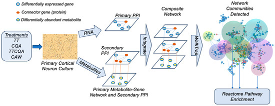 In this study, mouse primary cortical neurons were treated with either CAW, groups of TT or CQA compounds separately, or a combination of the two (TTCQA). The in vitro CAW concentration chosen (50 µg/mL) was previously found to increase dendritic arborization, synaptic density, mitochondrial biogenesis, and activation of antioxidant response in mouse primary hippocampal neurons [30,32,33]. In vivo, CAW administered in drinking water has also been shown to affect these same pathways in both the hippocampus and cortex of treated mice [24,29,34]. All compounds were applied at concentrations equivalent to their presence in CAW. Transcriptomic and metabolomic data were collected from these treated cells. The primary outcomes in this study, derived from these two untargeted molecular domains, are both the individual gene expression and metabolite abundance levels, as well as gene and metabolite signatures of co-expression and co-abundance. This design allowed us to assess the effects of, and nature of interactions between, the TT and CQA compounds, as well as interactions between these compounds and other unknown compounds in CAW, using these outcomes.