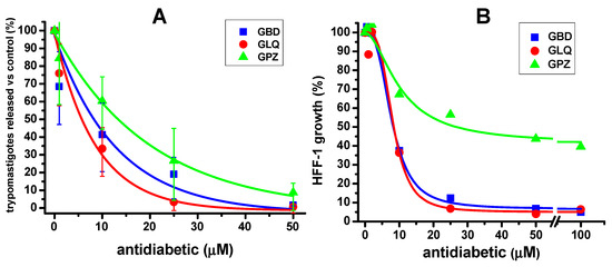Effect of antidiabetic drugs in monotherapy in a model of in vitro T. cruzi Querétaro strain infection. (A) The trypomastigotes burst after 5 days of in vitro infection in the presence of increasing concentrations of the antidiabetics is shown. In (B), the effect of the antidiabetics on cell host growth (HFF-1, human foreskin fibroblasts 1) after 5 days is shown. The experimental data points are the average and standard deviation of the number of independent experiments, which was n = 4 in (A) and n = 2 in (B). In (A), 100% trypomastigotes release in the absence of any drug (0 µM) was 1 ± 0.4 × 106 parasites/mL; in (B), 100% cell growth was 1.33 ± 0.0057 × 105 cells/mL. Data were fitted to the dose–response equation using Origin 8 Software.