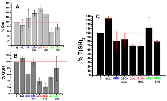 BNZ seems to slightly decrease the Cys level for GSH and T(SH)2 synthesis (Figure 4). GBD and GLQ alone decreased the levels of GSH and T(SH)2 and increased those of Cys, suggesting inhibition at the beginning of the pathway. Interestingly, GPZ alone increased the level of T(SH)2 and decreased the levels of Cys and GSH; however, the increase in T(SH)2 cannot explain the near 50% decrease in Cys and GSH. Remarkably, the combination of BNZ with any of the antidiabetics decreased the T(SH)2 levels (Figure 4C). The changes in these antioxidant metabolites suggested perturbation of the antioxidant system in the parasite.