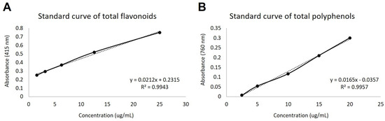 Standard curves for phytochemical analyses. (A) Standard curve for total flavonoid content, constructed using quercetin as standard, from a serial dilution of 25 μg/mL to 1.56 μg/mL (R2 = 0.9943). (B) Standard curve for total polyphenol content, constructed using gallic acid as standard, from different concentrations (2; 1.5; 1.0; 0.5; and 0.25 μg/mL—R2 = 0.9957). Solid lines represent measurements and the dashed lines represent the linear trend line.