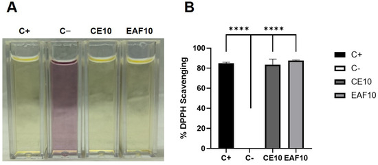 In addition, through the 2,2-diphenyl-1-picryl-hydrazyl (DPPH) assay, CE at a 10% concentration and EAF at a 10% concentration showed high scavenging capacities, respectively, 83.52% ± 5.62% and 87.43% ± 0.75%, with no significant differences between them (Figure 2A,B).