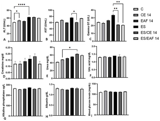 In non-induced animals but treated with CE or EAF for 7 days (CE7 and EAF7) there were no significant changes in the levels of the evaluated markers compared to group C. (Figure 4A–I). In contrast, non-induced animals and animals treated with CE for 14 days (CE14 group) showed elevated levels of ALT (p < 0.05) compared to those in group C (Figure 5A). However, treatment with EAF did not change the levels of markers evaluated in relation to group C (Figure 5A–I).