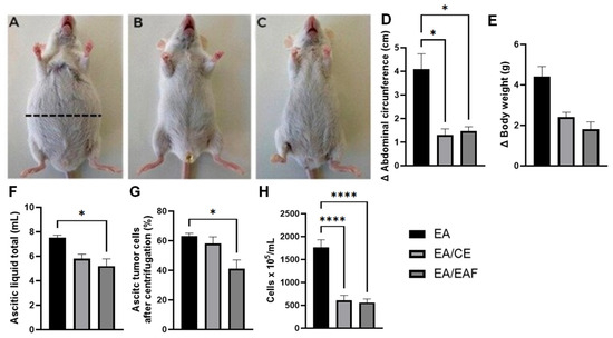After 7 consecutive days of treatment with CE and EAF, a reduction in abdominal circumference was observed in the EA/CE (p < 0.05) and EA/EAF (p < 0.05) groups compared to the EA group (Figure 6D). The rate of tumor growth reduction in relation to abdominal circumference was 66.66% in the CE group and 67.69% in the EAF, both considered high.