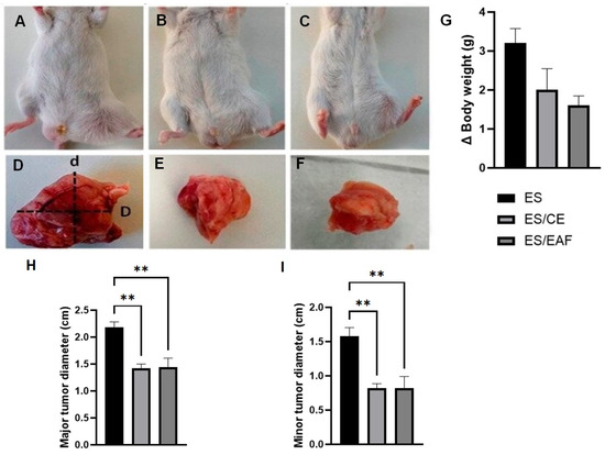 Both treatments with CE at 10% concentration and EAF at 10% concentration reduced the major (Figure 7H) (p < 0.01) and minor (Figure 7I) (p < 0.01) tumor diameters in relation to the ES group. Likewise, the analysis of tumor showed significant differences with reduction (p < 0.05) in the groups treated with CE (0.7448 ± 0.04857 mm3) and EAF (0.7700 ± 0.1879 mm3) compared to the treated animals (2.684 ± 0.6847 mm3).