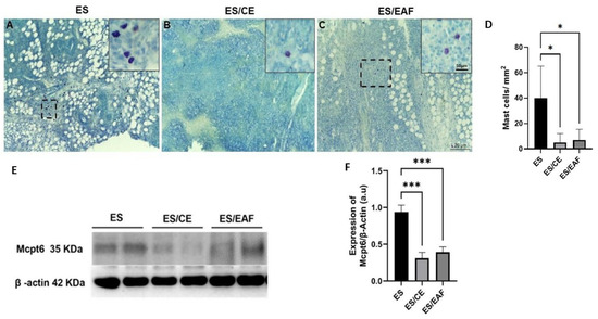 Several mast cells were observed in the tumor tissues of untreated animals. In treated groups, few cells could be identified (Figure 9A–C). Animals induced with solid tumor and treated with CE and EAF (ES/CE and ES/EAF groups) showed a reduction (p < 0.05) of mast cells in tumor tissue, compared to animals induced but without treatment (ES group) (Figure 9D). Similarly, decreased Mcpt6 expression (p < 0.001) was observed in animals induced with solid tumor and treated with CE and EAF (ES/CE and ES/EAF groups) (Figure 9E,F).