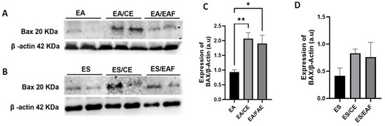 Analysis of Bax levels. Animals induced with ascitic Ehrlich tumors and treated with CE 10% concentration and EAF 10% concentration for 7 days (A,C). Animals induced with solid Ehrlich tumors and treated with CE 10% concentration and EAF 10% concentration for 14 days (B,D). Statistical analysis was conducted using one-way ANOVA, followed by Tukey’s multiple comparison test. Significance levels are indicated as * p < 0.05. and ** p < 0.01.