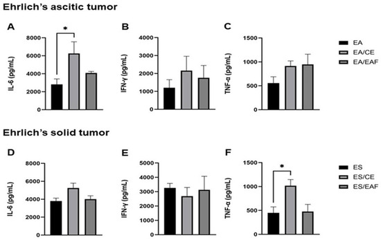 To evaluate the influence of CE and EAF treatments on the expression of pro-inflammatory cytokines, the levels of IL-6, IFN-γ and TNF-α were measured in the ascitic fluid and tumor tissue of animals induced with ascitic and solid Ehrlich tumors.