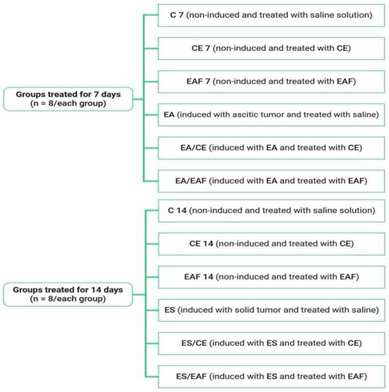 Among the enzymes, ALT is more precise for liver disease than AST, as AST may also be related to muscle injuries [32], which may explain the observed effect of the treatment on the levels of such enzymes. Due to its anatomical location, the liver can be more easily affected in the development of ascitic Ehrlich tumors, which can lead to increased ALT levels. On the other hand, in the development of the solid form, the invasion of muscle tissue by the tumor occurs, which can lead to increased AST levels. Our results indicate that the proposed treatments, especially using CE, reduced ALT levels in animals induced with Ehrlich’s ascitic tumor, as well as decreased AST levels in animals induced with solid Ehrlich tumor.