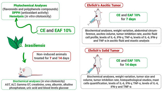 Considering the impact of cancer on global health, as well as the importance of medicinal plants in the search for new therapies, in this investigation, we studied the effects of the administration of crude extract (CE) and ethyl acetate fraction (EAF) of G. brasiliensis leaves in the ascitic and solid forms of Ehrlich’s tumor. Figure 12 summarizes all the results found in this investigation.