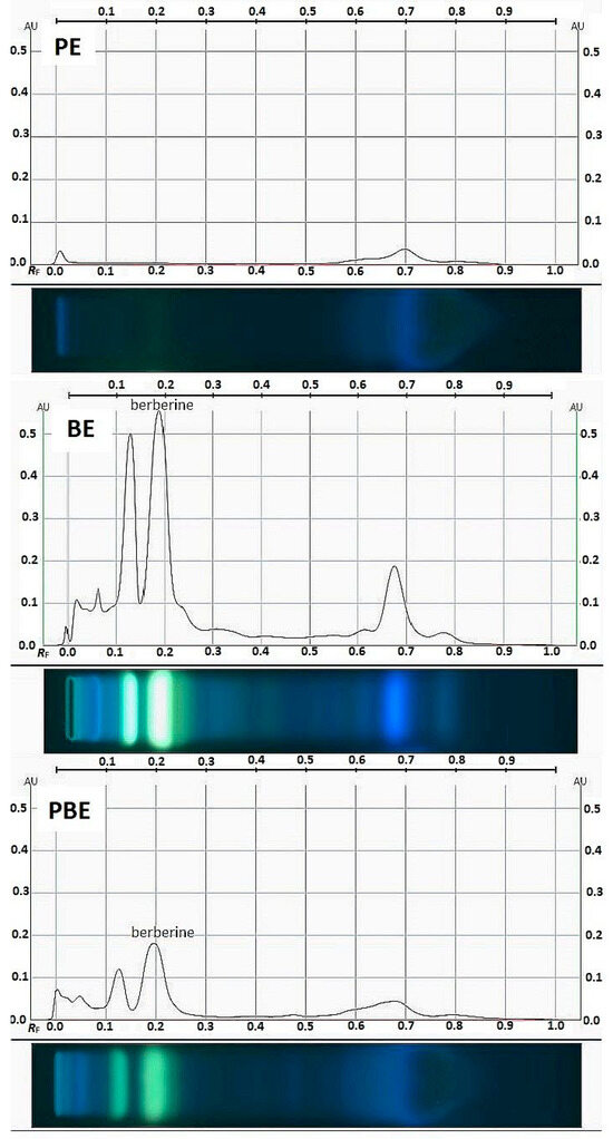 HPTLC profiles of the tested extracts (50 mg/mL) visualized in UV 366 nm. PE—propolis extract, BE—barberry root extract, PBE—propolis–barberry root extract.