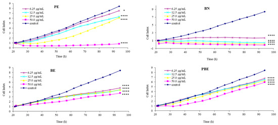 Changes in cell index after treatment with PE—propolis extract, BE—barberry root extract, BN—berberine, PBE—propolis–barberry root extract at tested concentrations (6.25, 12.5, 25.0, and 50.0 µg/mL) in comparison to a control group without treatment. Statistical processing of the results at the end of treatment (72 h) is shown as significance compared to the control group (one-way ANOVA followed by post hoc Dunnett’s test: * p < 0.05, **** p < 0.0001).