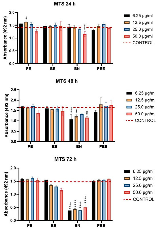 Results of the MTS assay on HEK293T cells after 24, 48, and 72 h. Cells were cultured in media supplemented with PE—propolis extract, BE—barberry root extract, BN—berberine, PBE—propolis–barberry root extract at various concentrations (6.25, 12.5, 25.0, and 50.0 µg/mL) and a standard culture medium in the case of the control. Statistical processing of the results is shown as a significance compared to the control group (one-way ANOVA followed by post hoc Dunnett’s test: ** p < 0.01, *** p < 0.001, **** p < 0.0001). The data is presented as the mean ± SD (n = 3).