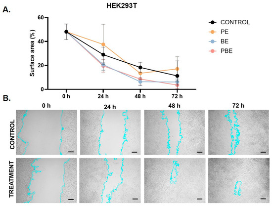 The effect of the PE, BE, BN, and PBE on the metabolic activity (MA) of HEK293T cells was evaluated via a standard colorimetric MTS test after 24, 48, and 72 h of application of the extracts (Figure 3).