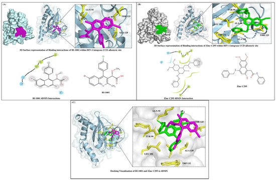 Visualization of molecular docking interactions between BI-1001 and Zinc C295 with the HIV-1 IN catalytic core domain (CCD) allosteric site (PDB ID: 4DMN). The figure presents 3D representations of the docking interactions generated using PyMOL and 2D representations created with Maestro, along with the ligand structures drawn in Marvin: (A) BI-1001 (magenta), (B) Zinc C295 (green), and (C) the combined interactions of BI-1001 and Zinc C295 with HIV-1 IN. In the 2D interaction diagram, the residues involved in hydrogen bonds are indicated in blue, including Gln95, Thr124, and Thr125, while the residues engaged in hydrophobic interactions are shown in green, such as Trp132, Ala128, and Ala129. Key binding interactions are highlighted to illustrate the molecular interactions involved in the binding efficacy of both ligands.